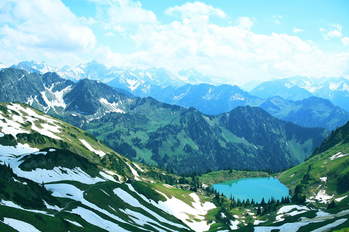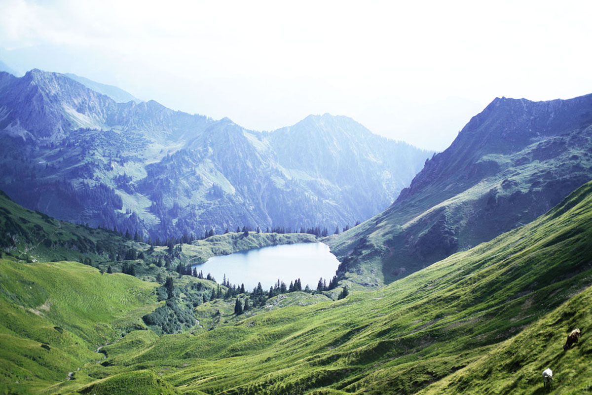 Lake Seealpsee is situated right behind the Zeigersattel at Nebelhorn Mountain in Oberstdorf and we promise: it will take your breath away from the very first second: The deepest and bluest waters, surrounded by green lawn, cows and a spectacular view of the surrounding mountains including Mt. Höfats.