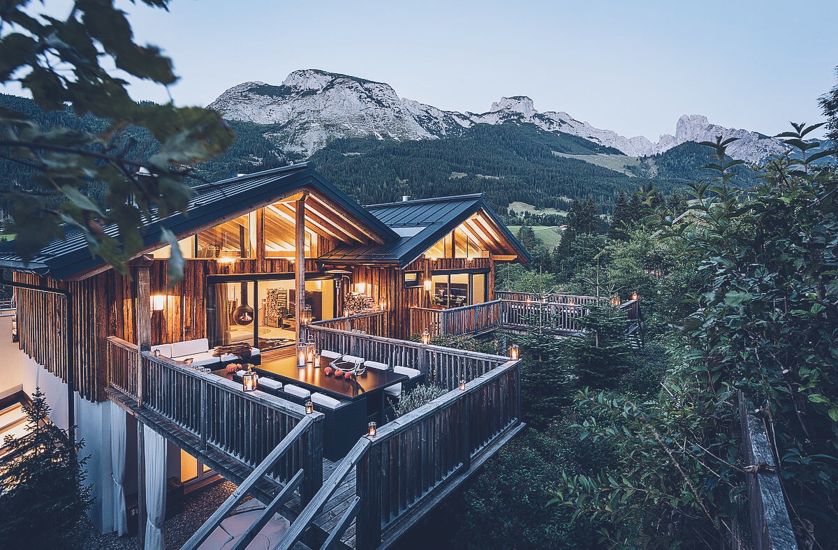 A gas station as reception area at a hotel which names itself „Luxuslodge“ (luxury lodge). What may seem to be an unusual combination, proves to be a sophisticated concept for a break from everyday life immediately after arriving. Christine Schwaighofer, a gas station operator in Annaberg in the Lammertal Valley realized her idea of the perfect holiday home just three years ago. The three chalets “Bischofsmütze”, “Mahdalm” and “Riedelkar” are the proof that the word „perfect“ is in no way an exaggeration.